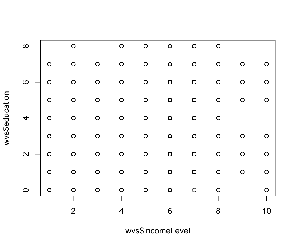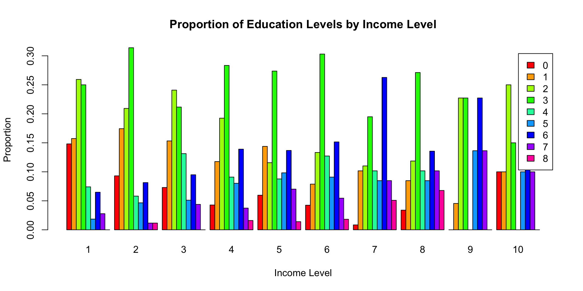 # Create a contingency table of income level and educationincome_education_counts <-table(wvs$incomeLevel, wvs$education)# Calculate proportions within each income levelincome_education_props <-prop.table(income_education_counts, 1)# Use barplot() to draw the bar chart with proportionsbarplot(t(income_education_props), # Transpose to have education levels as barsmain ="Proportion of Education Levels by Income Level",xlab ="Income Level",ylab ="Proportion",col =rainbow(ncol(income_education_props)),legend =colnames(income_education_props),beside =TRUE)