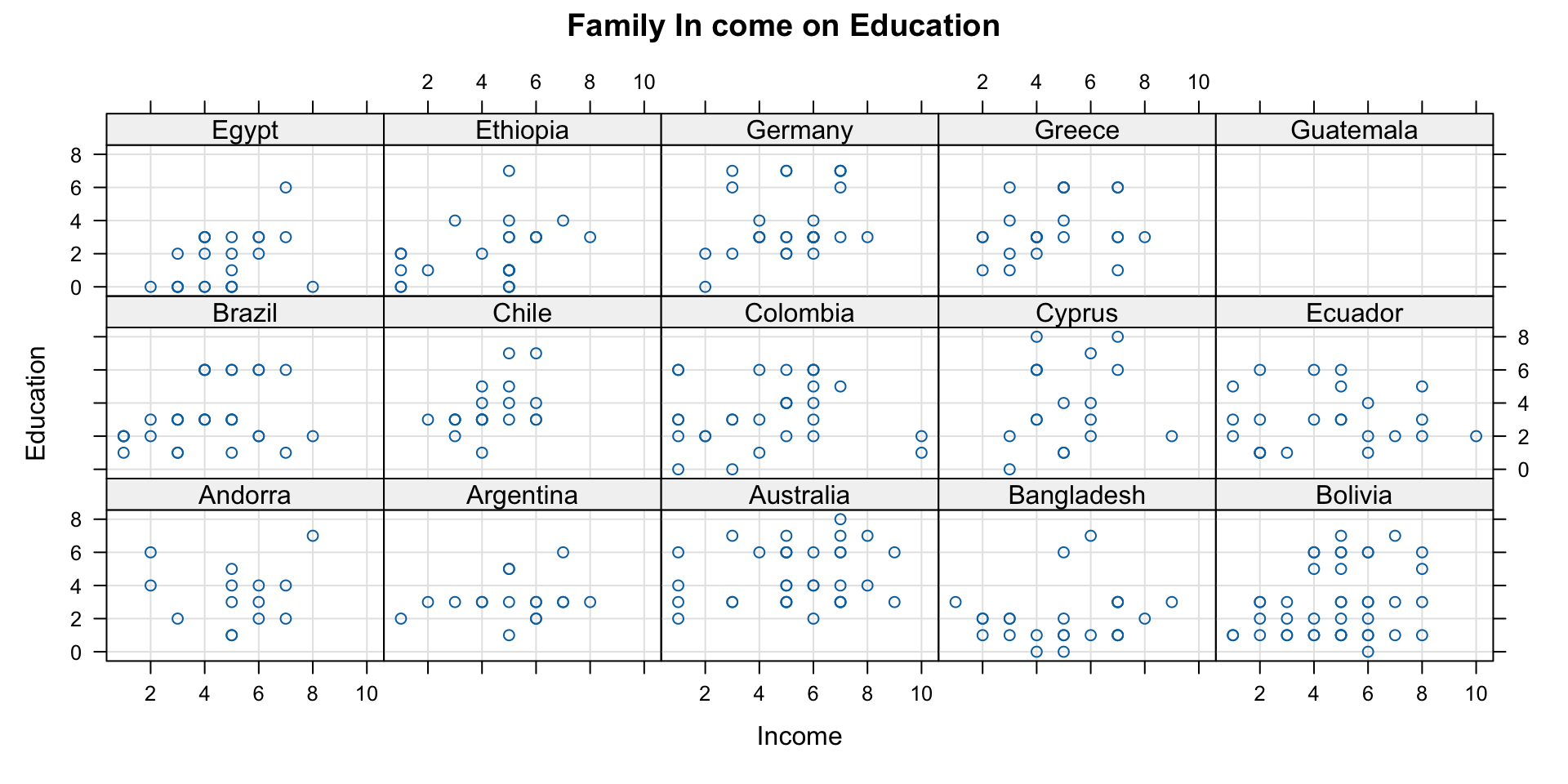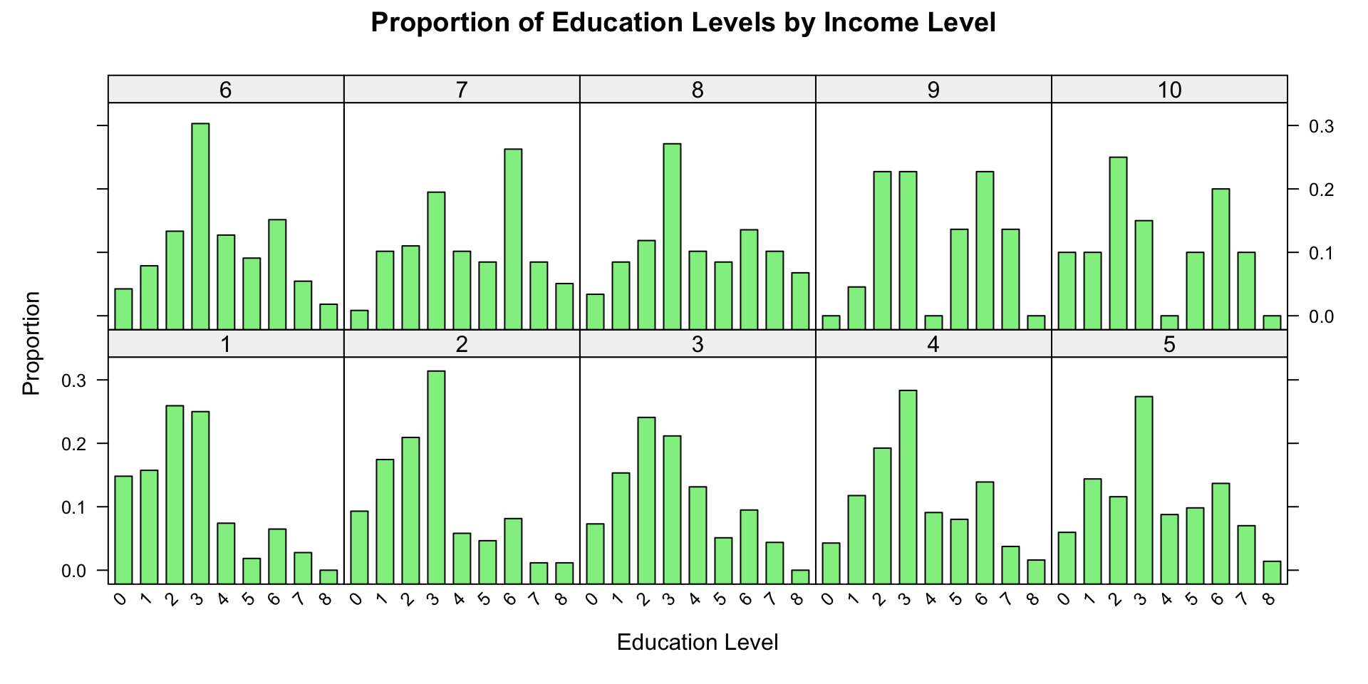 # Load the lattice packagelibrary(lattice)# Calculate proportions for each income levelprop_data <-as.data.frame(prop.table(table(wvs$incomeLevel, wvs$education), 1))# Use barchart() to draw the bar chart with proportionsbarchart( Freq ~ Var2 | Var1,data = prop_data,main ="Proportion of Education Levels by Income Level",xlab ="Education Level",ylab ="Proportion",col ="lightgreen",horizontal =FALSE,scales =list(x =list(rot =45)))