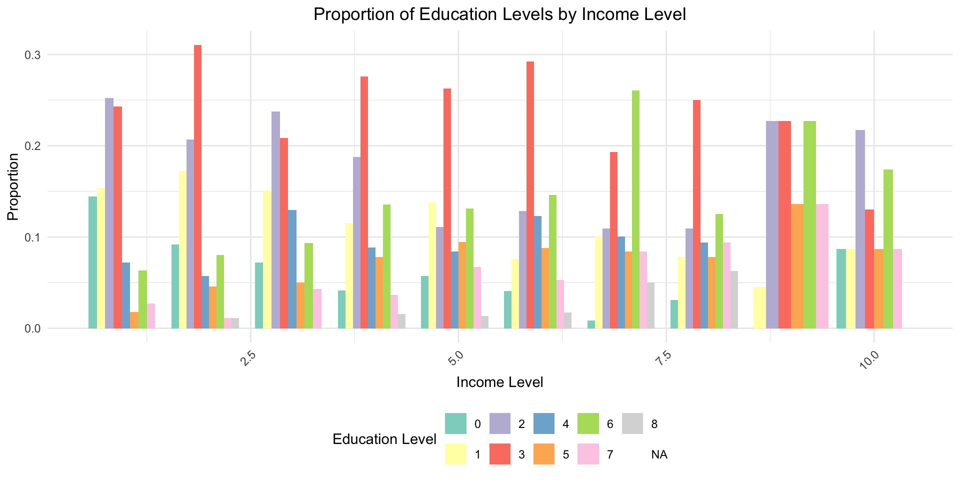 # Load the ggplot2 packagelibrary(ggplot2)library(dplyr)# Calculate proportions within each income levelprop_data <- wvs %>%group_by(incomeLevel, education) %>%summarise(count =n()) %>%mutate(proportion = count /sum(count))# Use ggplot2 to draw the bar chart with proportionsggplot(data = prop_data, aes(x = incomeLevel, y = proportion, fill =factor(education))) +geom_bar(stat ="identity", position ="dodge") +labs(title ="Proportion of Education Levels by Income Level",x ="Income Level",y ="Proportion",fill ="Education Level" ) +theme_minimal() +theme(plot.title =element_text(hjust =0.5),legend.position ="bottom",axis.text.x =element_text(angle =45, hjust =1) ) +scale_fill_brewer(palette ="Set3")
