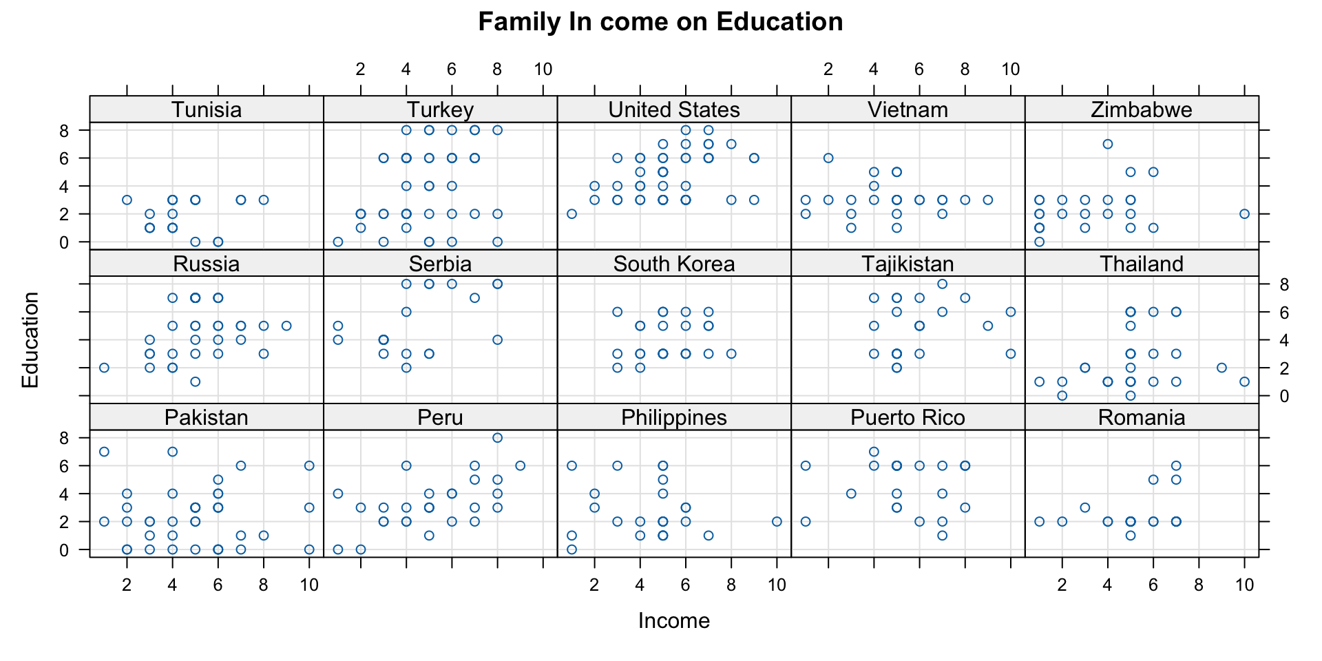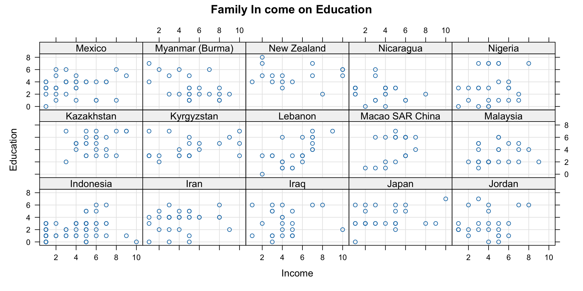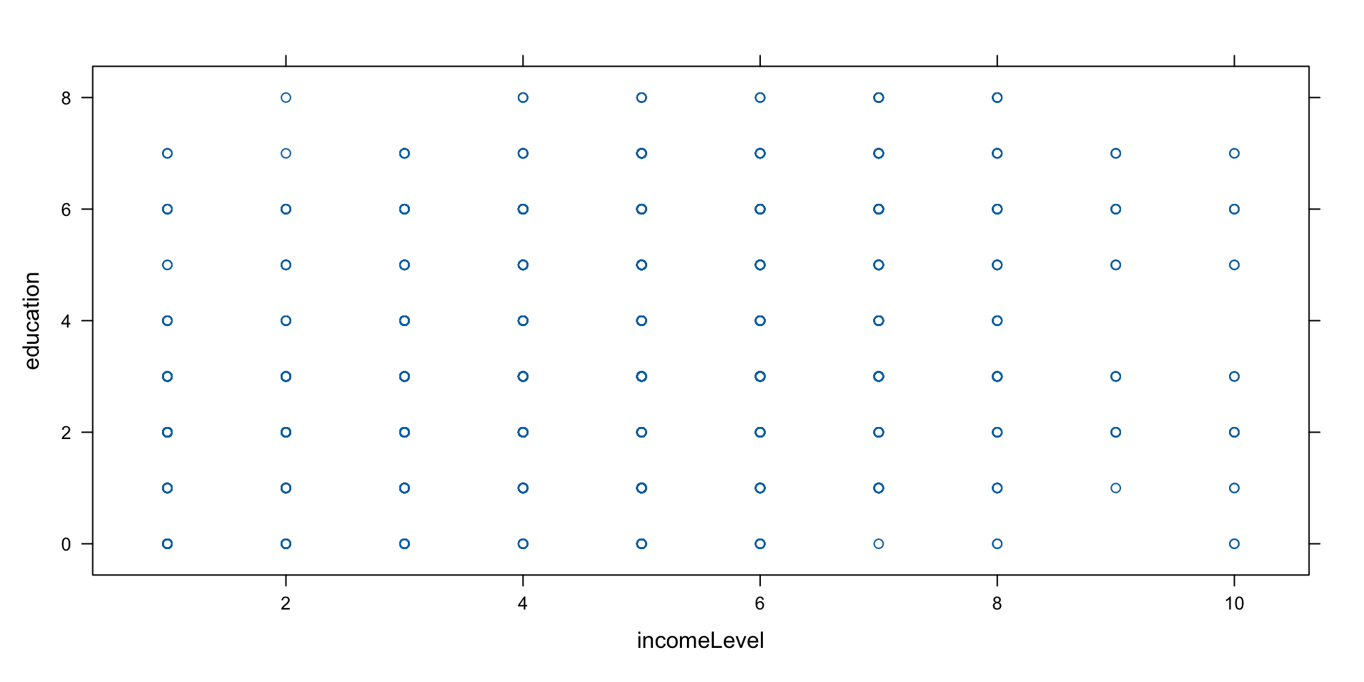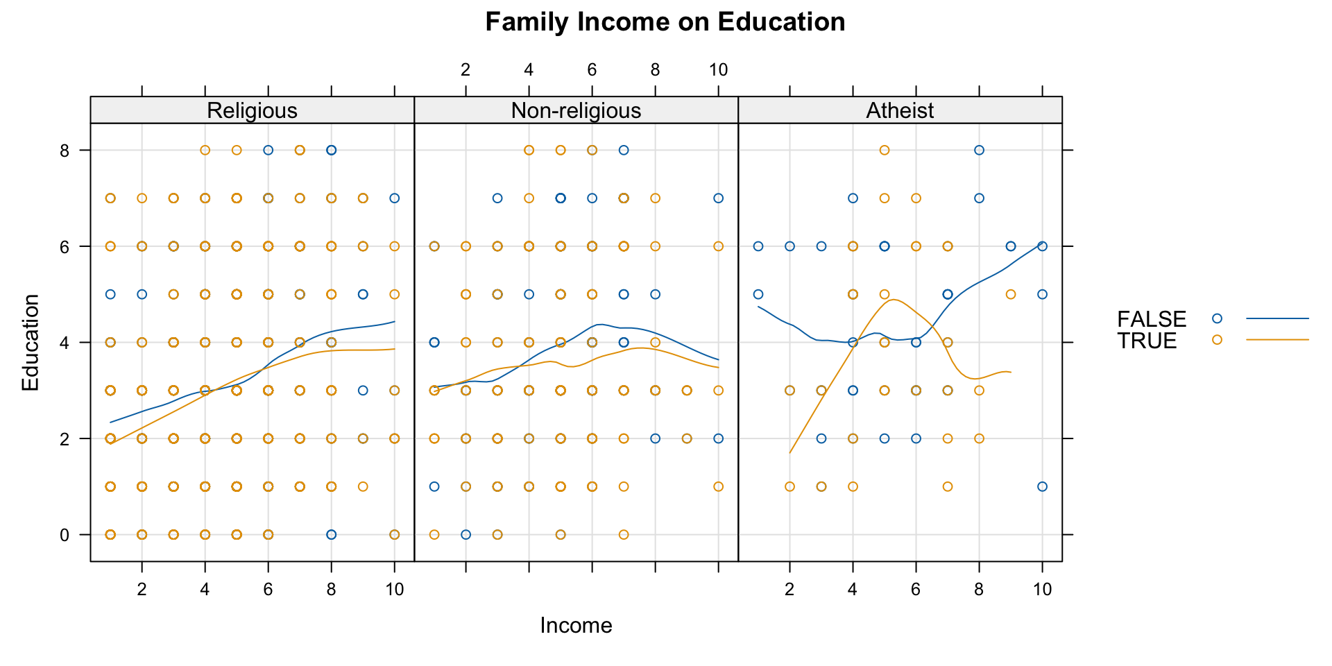 ggplot(data = wvs,aes(x = incomeLevel, y = education, color = religious))
