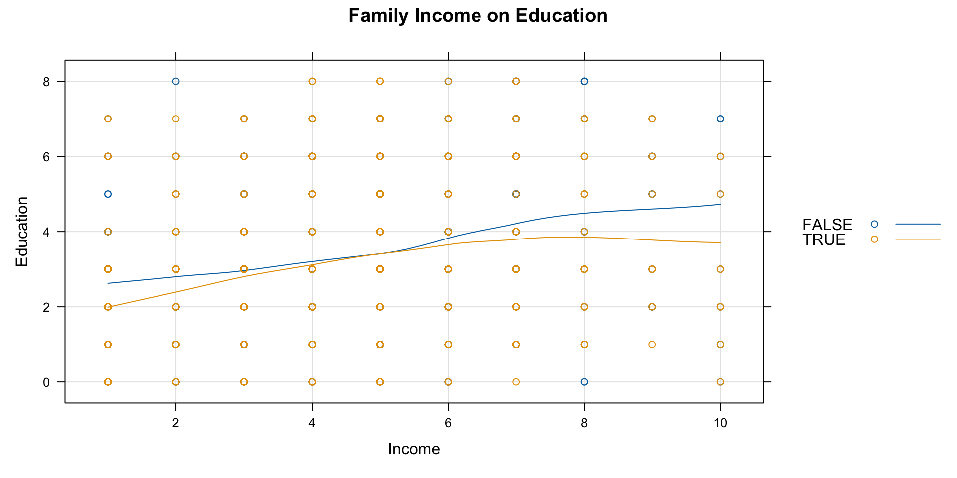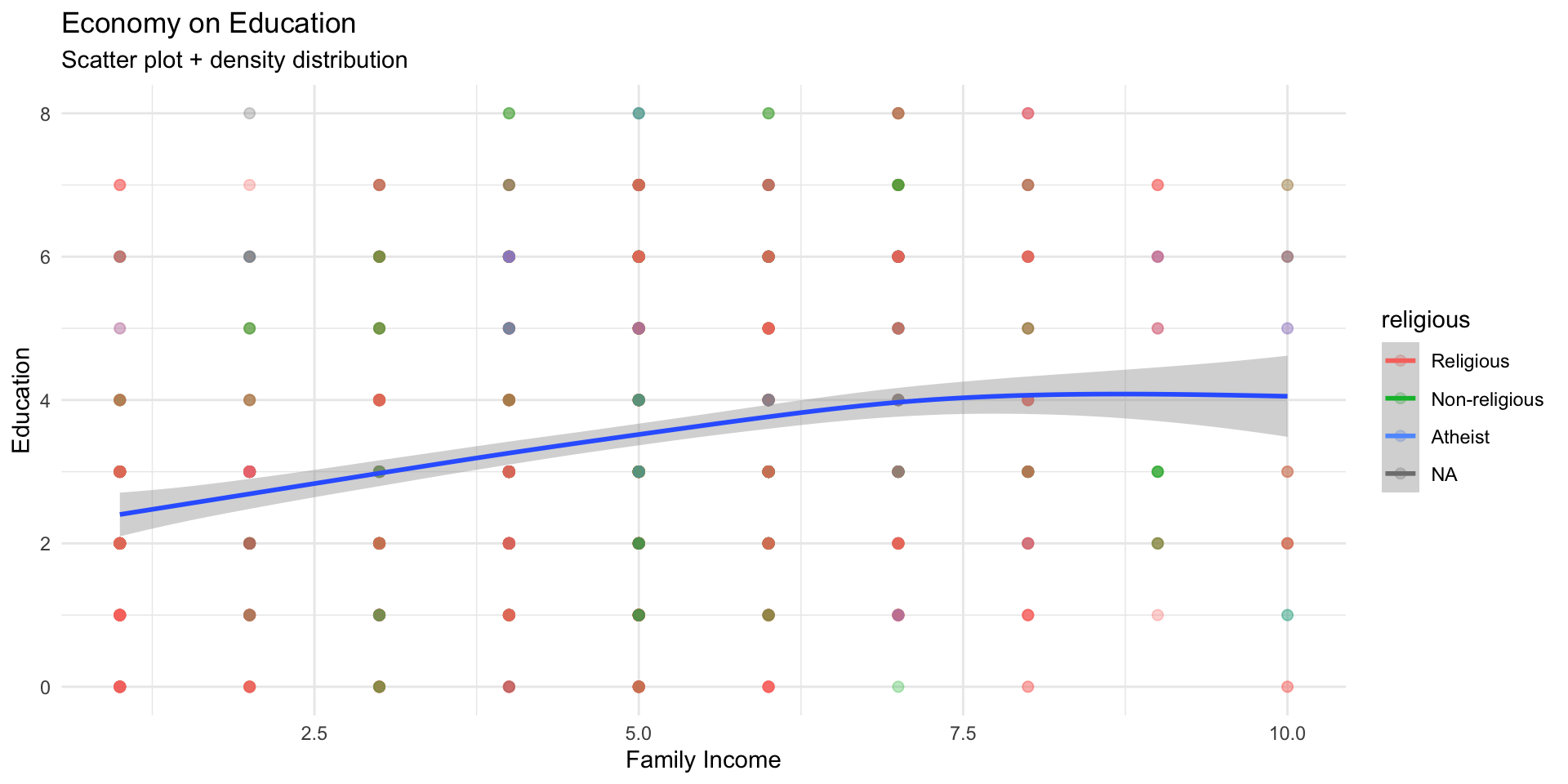ggplot(data = wvs,aes(x = incomeLevel, y = education, color = religious)) +geom_point(size =2, alpha =0.3) +geom_smooth(aes(color =NULL), se=TRUE) +labs(title ="Economy on Education" ,subtitle ="Scatter plot + density distribution",x ="Family Income", y ="Education") +theme_minimal()